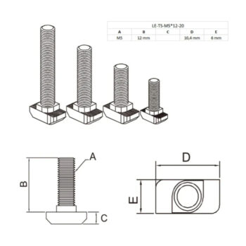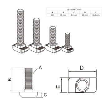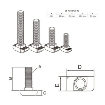T-vijak od prohroma za aluminijske profile je vijak s glavom u obliku slova „T“, dizajniran za brzo i sigurno umetanje u utore aluminijskih profila bez potrebe za dodatnim alatima. Izrađen od nerđajućeg čelika , otporan je na koroziju, što ga čini idealnim za unutrasnju i spoljnu upotrebu.