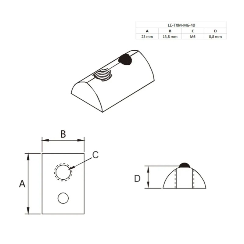 T matica izrađena je od visokokvalitetnog nerđajućeg čelika (prohroma), što osigurava izuzetnu otpornost na koroziju, trajnost i pouzdanost u različitim uslovima primene. Integrisana kuglasta opruga omogućava lako i precizno pozicioniranje unutar aluminijumskih profila, čime se olakšava montaža i pruža dodatna sigurnost spoja.